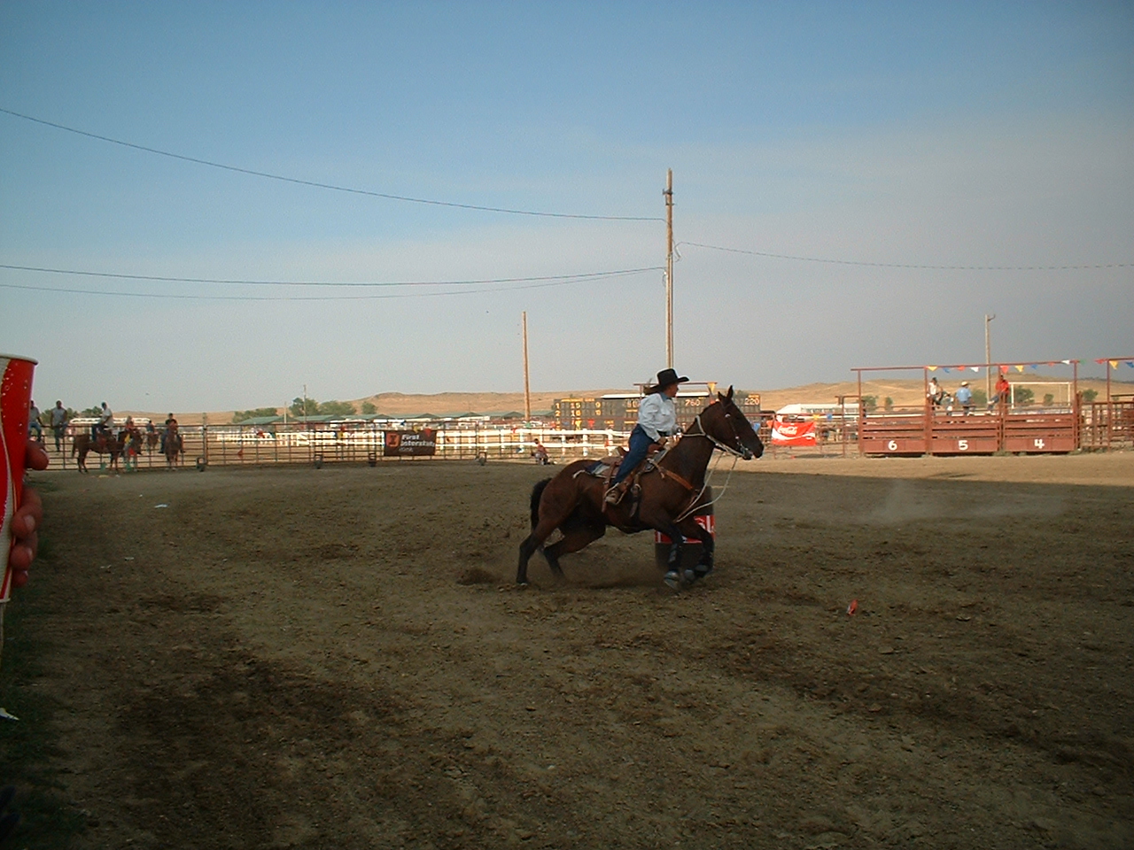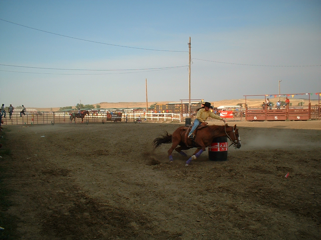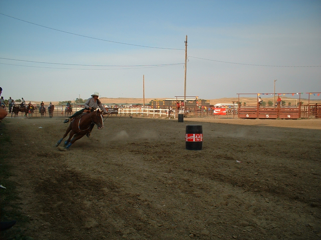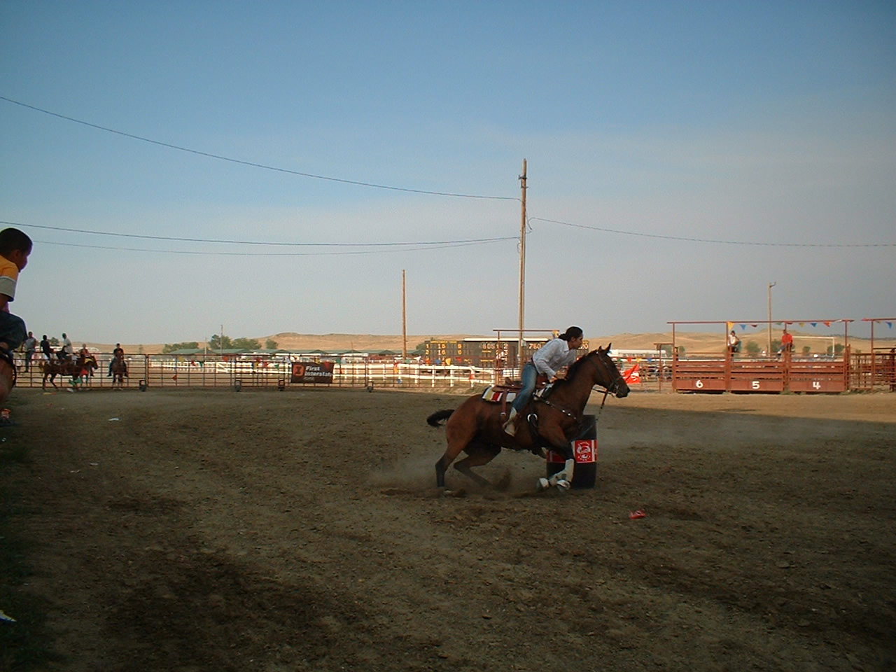 Kvinderne havde deres egne konkurrencer; her er det "barrel racing", der går ud på hurtigst muligt at kunne ride en bane rundt med 4 tønder.