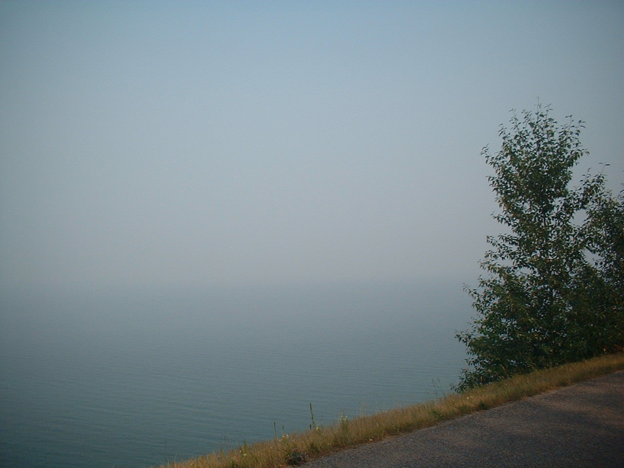 ... her er vi ca. 10 miles inde ad "Going To The Sun" vejen - dette skulle være en af USA's smukkeste udsigter med søen forrest og flotte bjerge bagved -, men pga. røg kan vi kun se de første 20 meter af søen og så ikke mere...