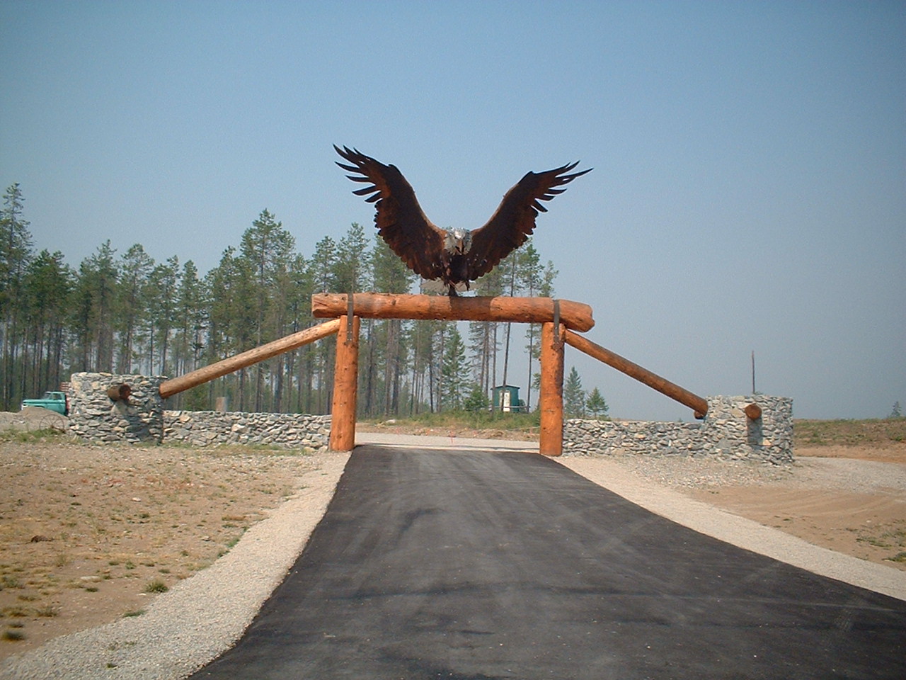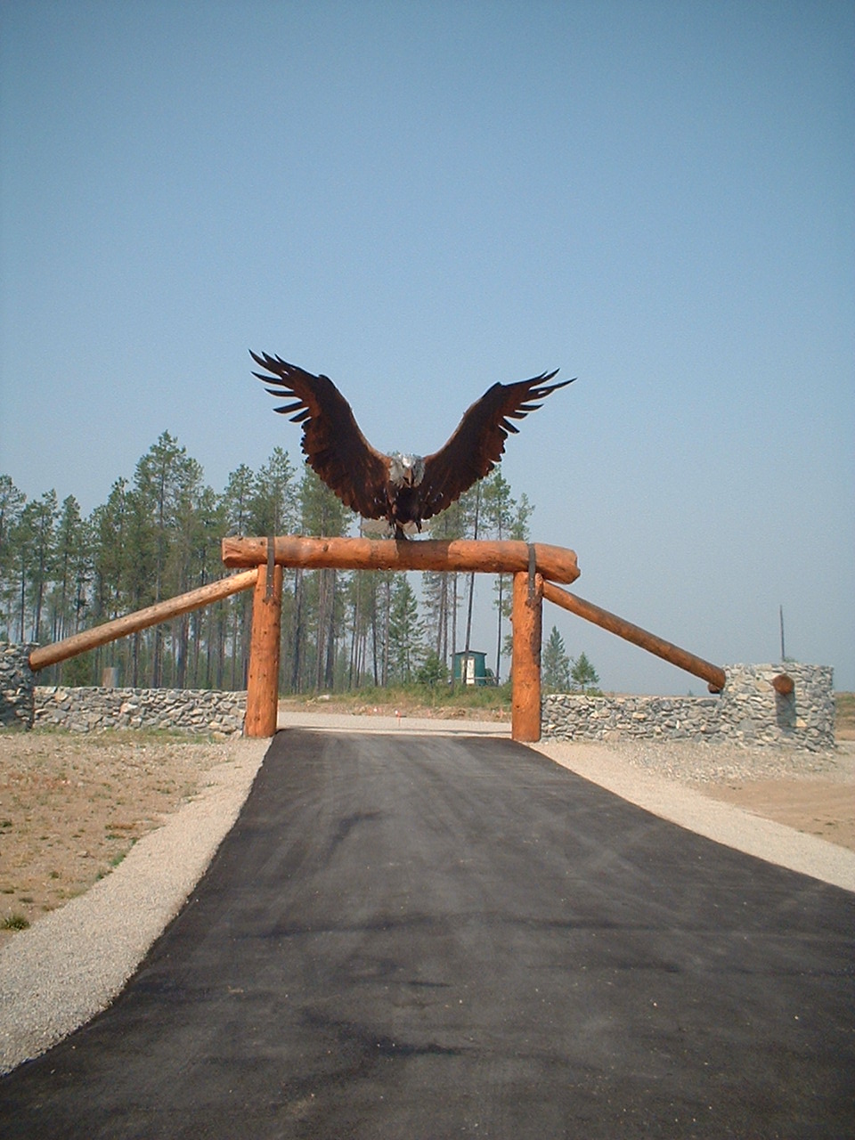 Udenfor Glacier nationalparken ligger et helt bælte af turist relaterede indretninger - lige fra moteller over campingpladser til dyreparker og vandland. Vi kom forbi denne flotte indgang til et af disse steder, først troede vi at ørnen var lavet af træ, men ved nærmere øjesyn viste den sig at være af gammel jern.