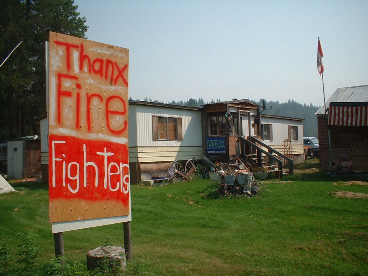 Et intermistisk skilt ved vejen udtrykker beboernes taknemmelighed overfor branmændenes ulige kamp mod flammerne.