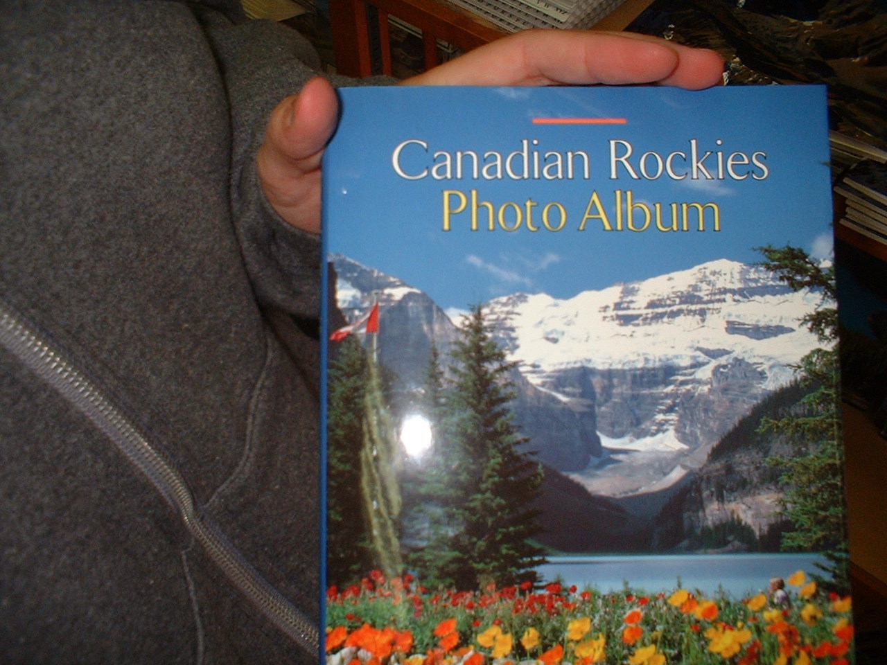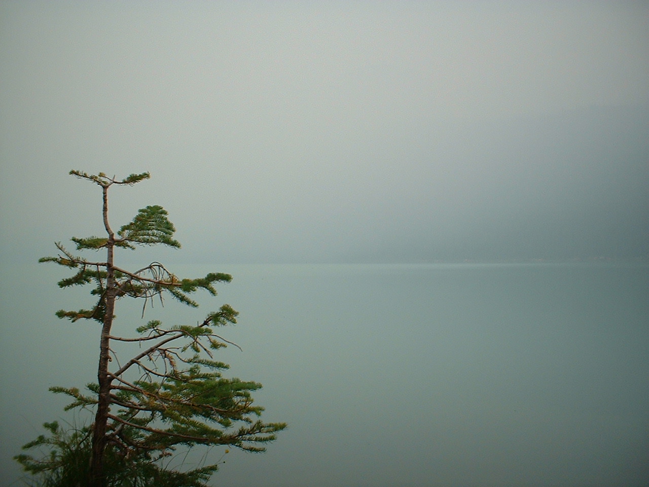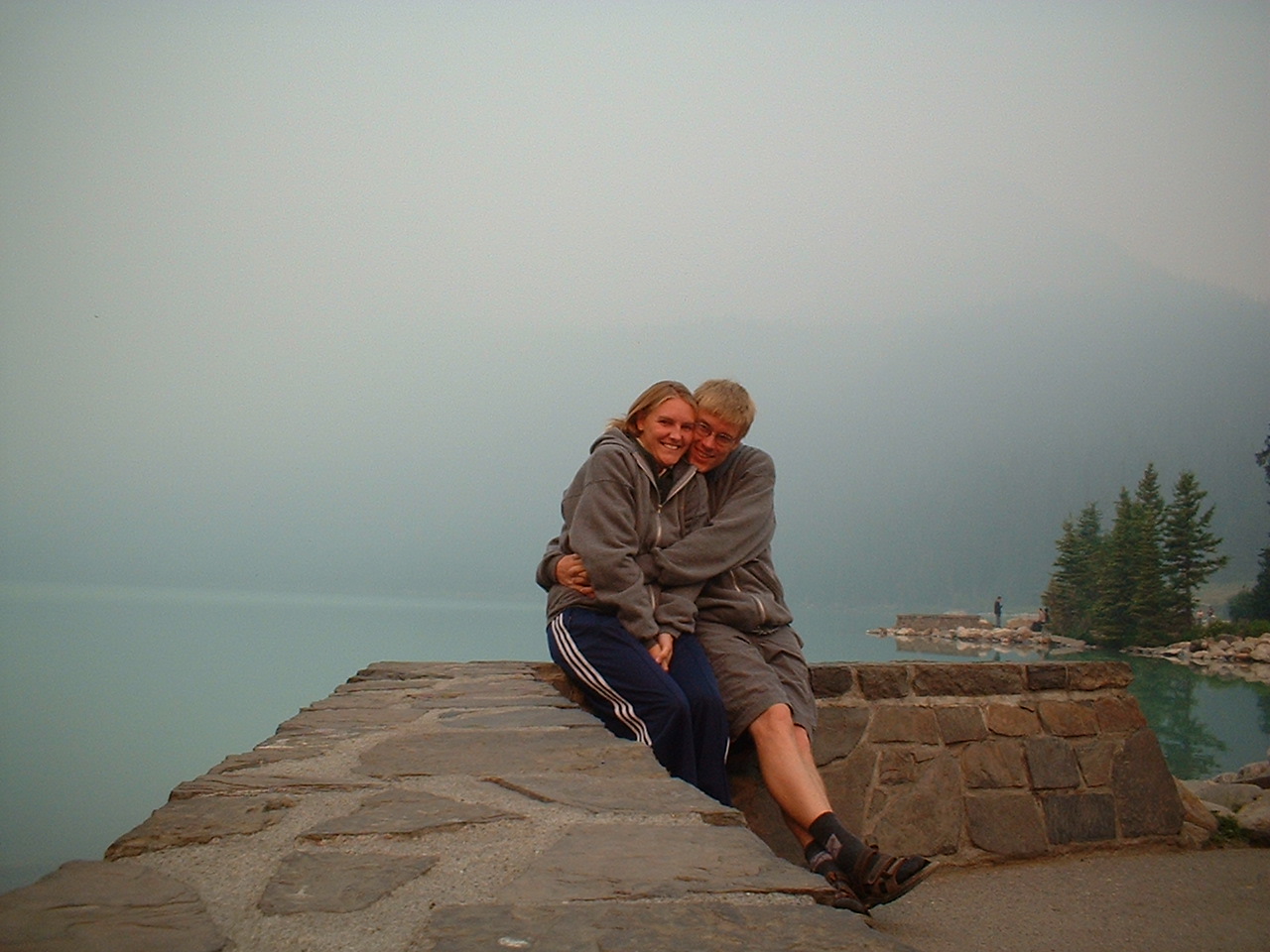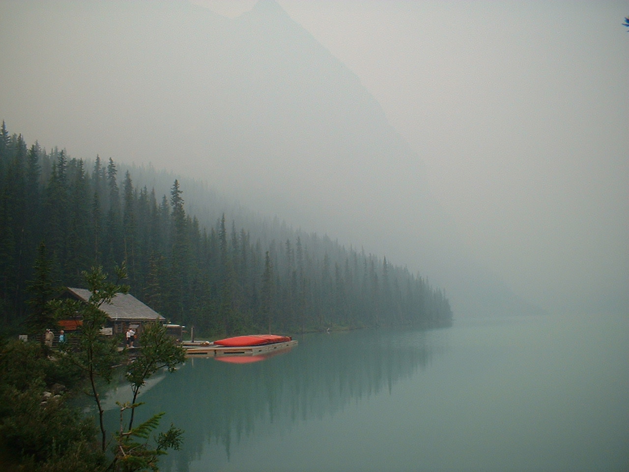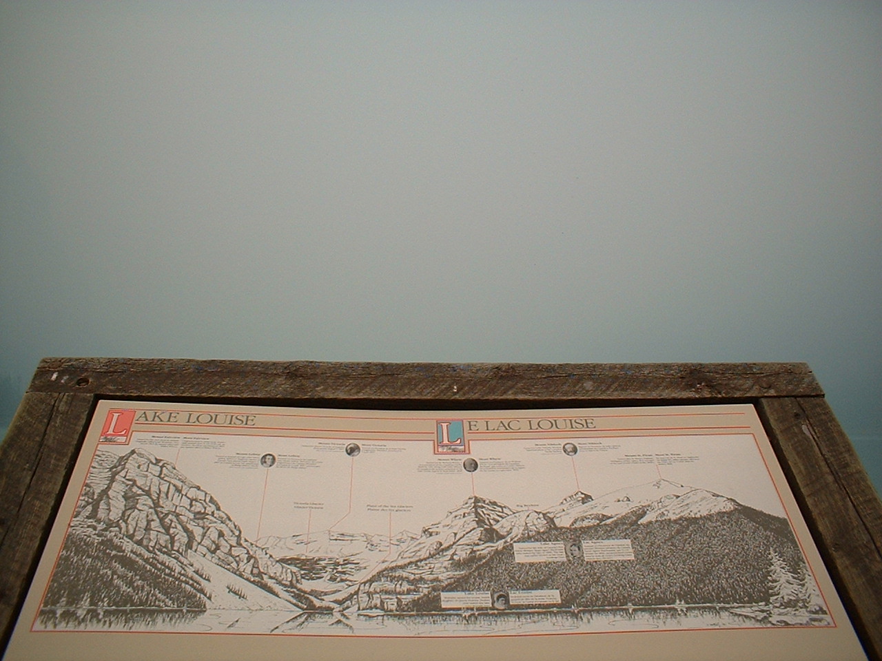 Lake Louise.... berømt for bjergene der rejser sig bagved søen og vandets specielle grøn-blå farve. I dagens anledning er alt dette dog gemt bag et tykt lag røg; imens kan vi så nyde sceneriet på infotavlen - som det skulle have set ud!