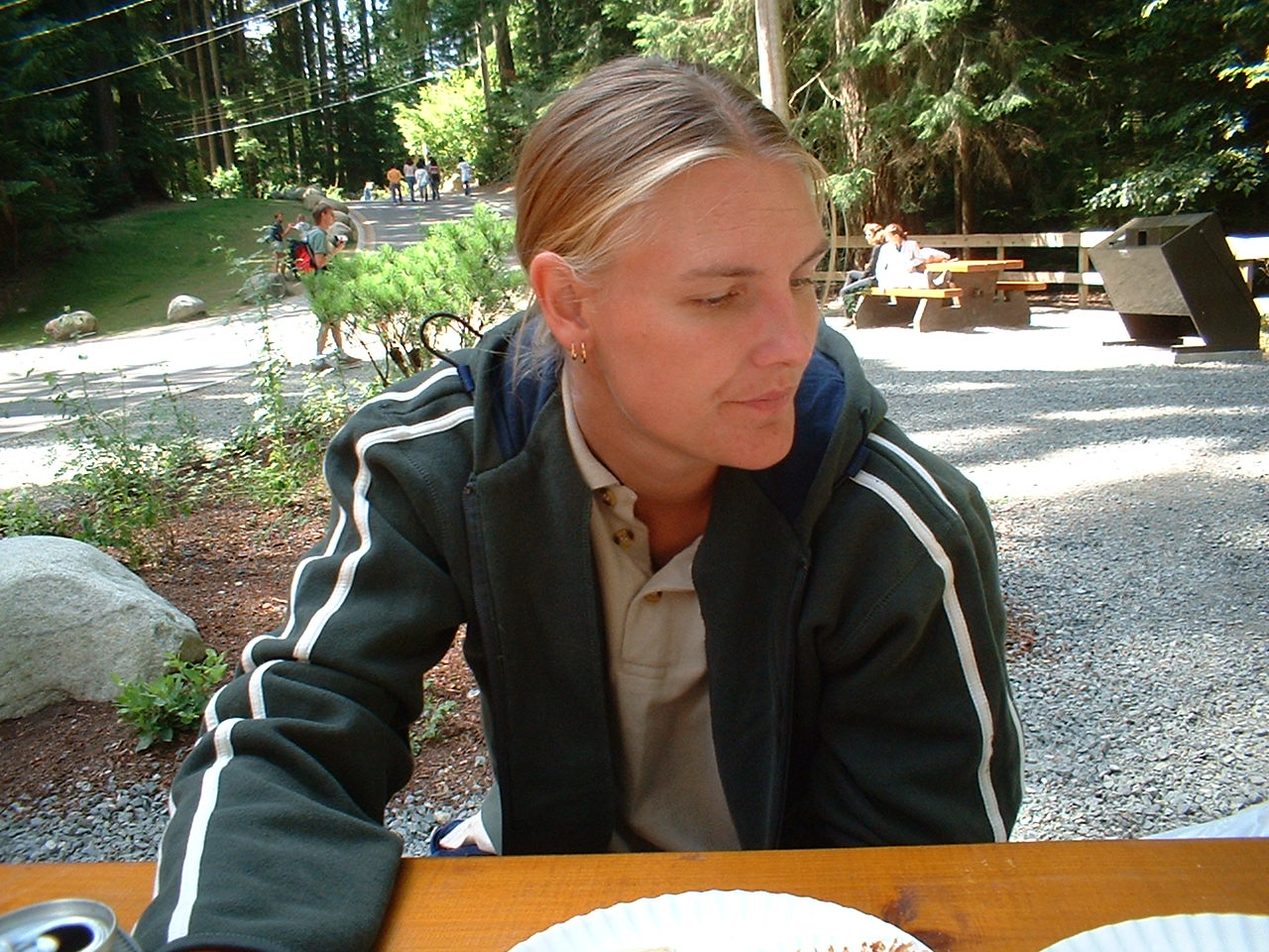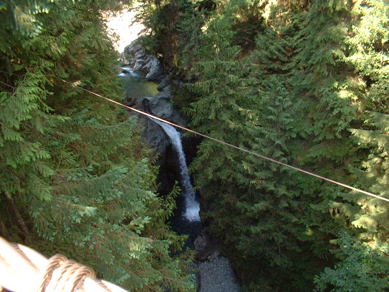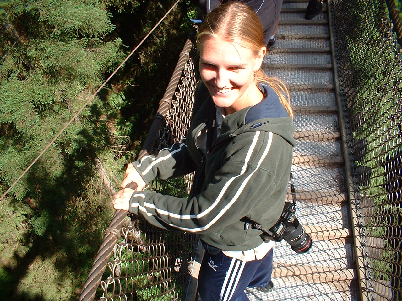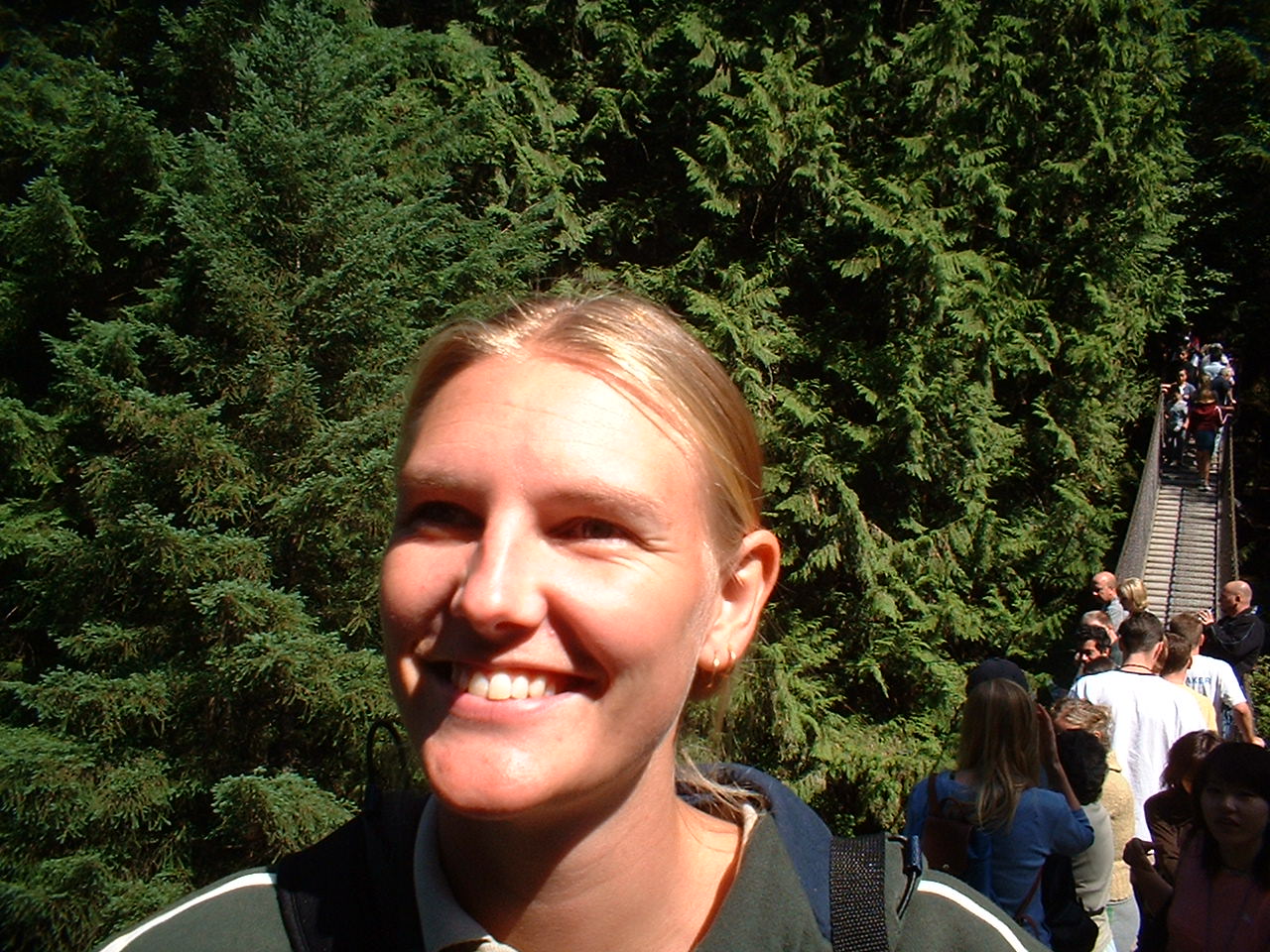 Vancouver er kendt for sine hængebroer - vi har ikke præcis kunnet blive kloge på, om broerne har tjent et praktisk formål i tidernes morgen; alt tyder på at broerne alene er lavet for at underholde turister. Vi valgte at "prøve" en af de mindre broer, som samtidig udmærkede sig ved at være gratis... Ann er ikke just stolt af situationen...