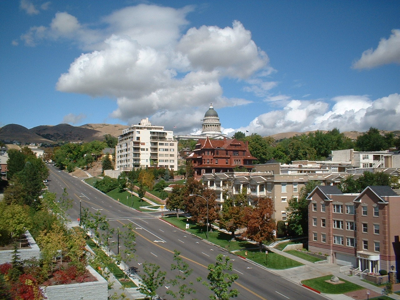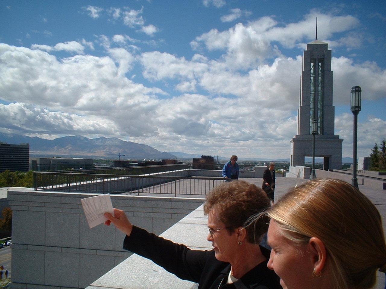 Udsigten fra konference-centerets tag ned over Temple Square.