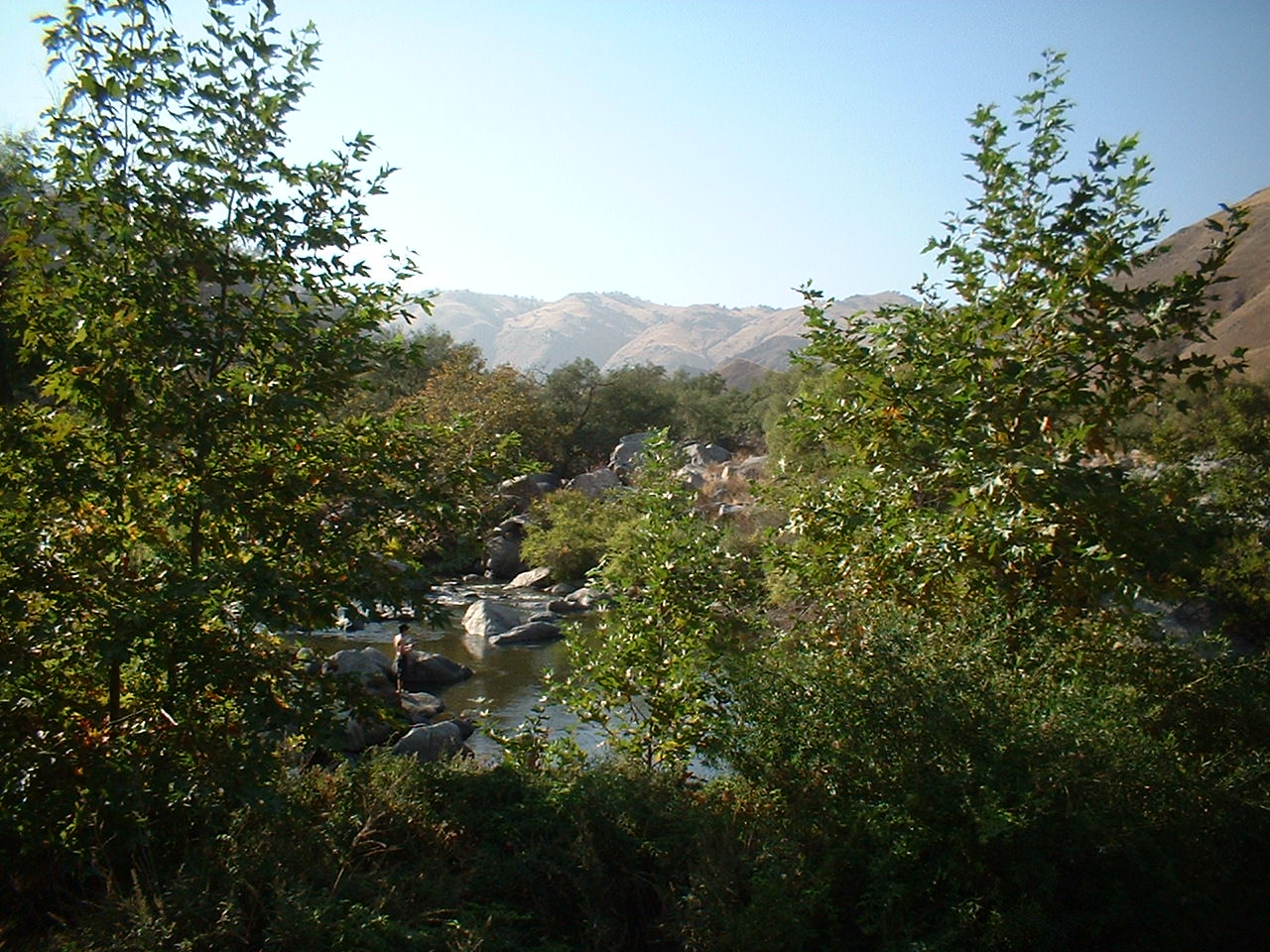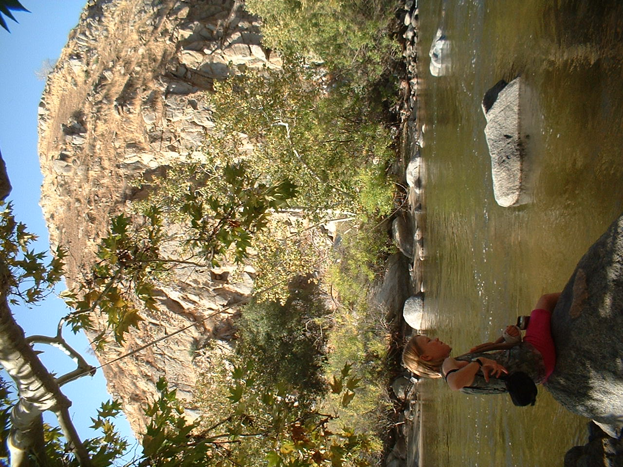 Anns Mor er ved at få spat af det tørre landskab uden særlig meget grønt, så da vi kommer forbi en flod, gør vi holdt for at "vaske støvet af os" - billedligt talt :-)